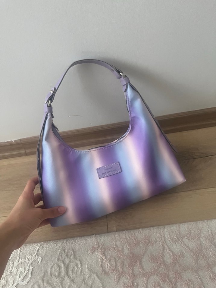 Kadın çantası, parlak sentetik kumaş ve pastel mor tie-dye deseniyle trend sokak stiline uygundur.