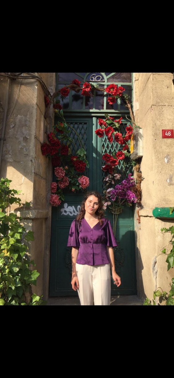 Parlak, ipeksi kumaştan, kısa kollu, transparan ve bol kesim mor bluz. V yakalı ve midi boyda, parti için uygun.