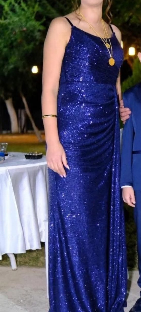 Parlak mor ışıltılı kumaş, kesimli uzun elbise; askılı kollu, yakasında kesik detay ve bağlama desenli, gösterişli gotik tarzda. 1kez giydim 172 boy 70 kg