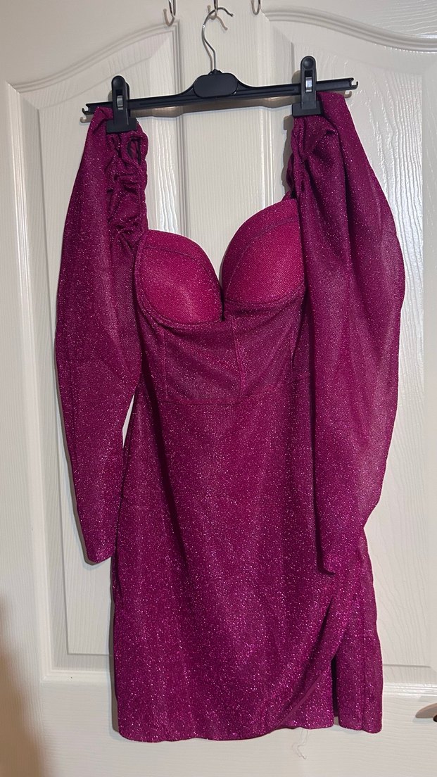 Parlak kumaştan yapılmış, drapeli ve V yakalı, ince askılı, uzun ve vücuda oturan mor abiye elbise. Desensiz, modern tarzda ve parti için uygundur.