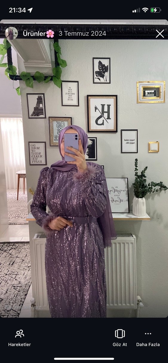 42 beden Şal dahil Uzun, bol kesim, yüksek yakalı ve uzun kollu bu parlak mor abiye elbise, tie-dye deseni ve sim detaylarıyla düğünler için uygundur.