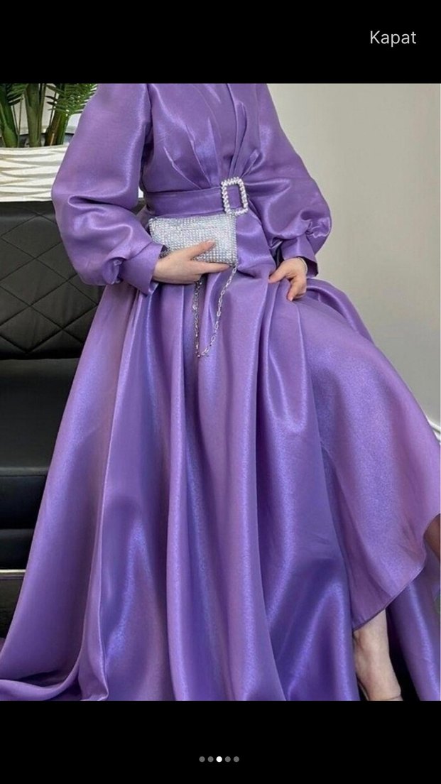 Parlak mor renkte, yüksek yakalı ve uzun kollu, bol kesim drapeli abiye elbisedir. Düğünler için uygundur.