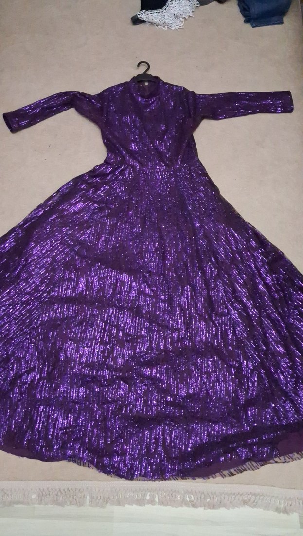 Parlak kumaştan, uzun kollu ve tek renk mor elbise. Tekne yaka ve vücuda oturan kesimiyle gösterişli ve modern tarzlar için uygundur.
