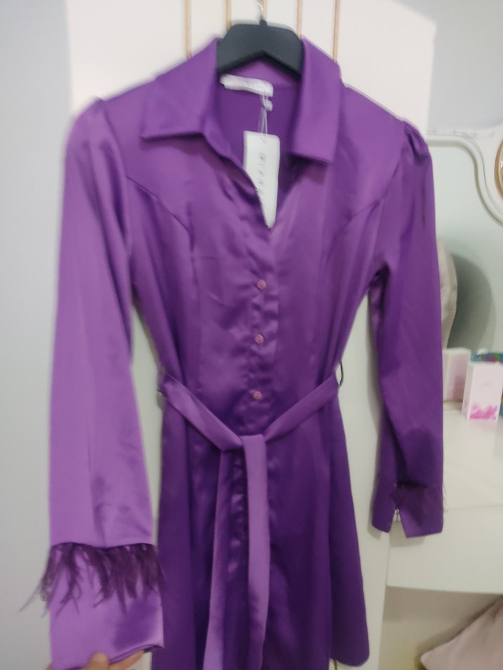 Parlak mor renkte, baskılı desenli, uzun kollu ve kemerli bohem tarzda Paris etkili kadın elbisesi. sol.kolda puskulun yarısi döküldü dolapta alınıp dikilebilir