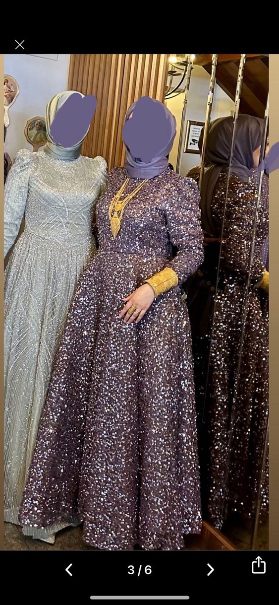 Bu dar kesim, uzun boy nişan elbisesi yüksek yakalı ve uzun kolludur. Parlak mor renkte, simli desenlidir ve düğünler için uygundur. ✨