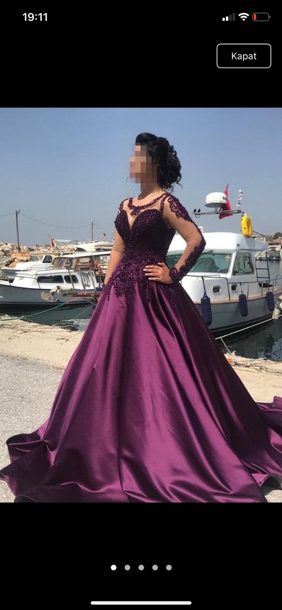 Parlak mor kumaştan, V yaka ve uzun kollu, drapeli ve desenli, fitted kesim nişan elbisesi. Gotik tarzda cesur tasarımıyla düğün için uygundur.