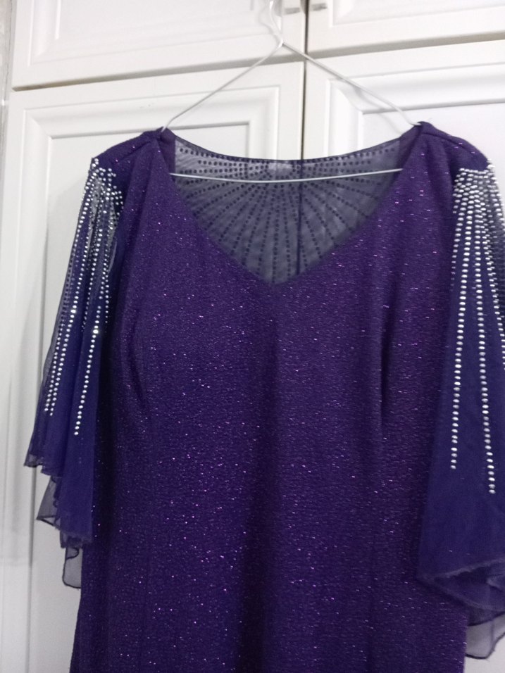 Parlak mor kumaştan, uzun ve bol kesim kadın abiye elbise. V yaka ve drapeli, süslü tül kollarıyla göz alıcı bir tasarım. ✨
