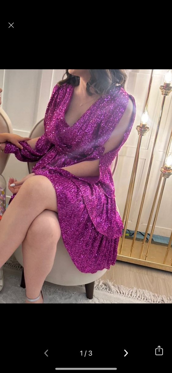 Parlak simlerle süslenmiş mor, v yaka ve askılı kolları olan, parti için uygun, vücuda oturan midi boy elbise. ✨