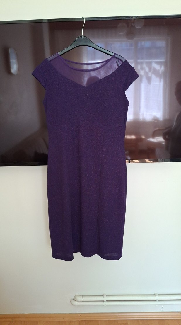 Parlak mor kumaştan, v-yaka ve drapeli, ince kesim midi elbise. Kolsuz ve minimalist gotik tarzda, romantik akşamlar için uygun.
