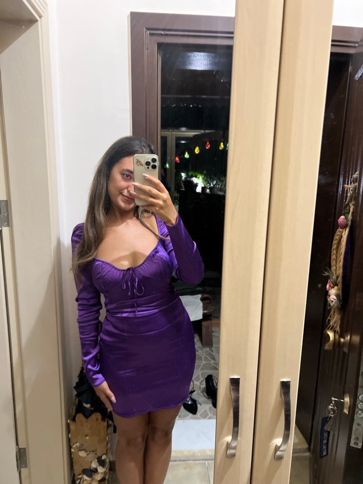 Parlak saten kumaştan, uzun kollu ve V yakalı, vücuda oturan mor mini elbise. Gösterişli goth tarzında, romantik akşamlar için şık ve rahat. Zara elbise S m bedene olur 161 boyum 54 kiloyum