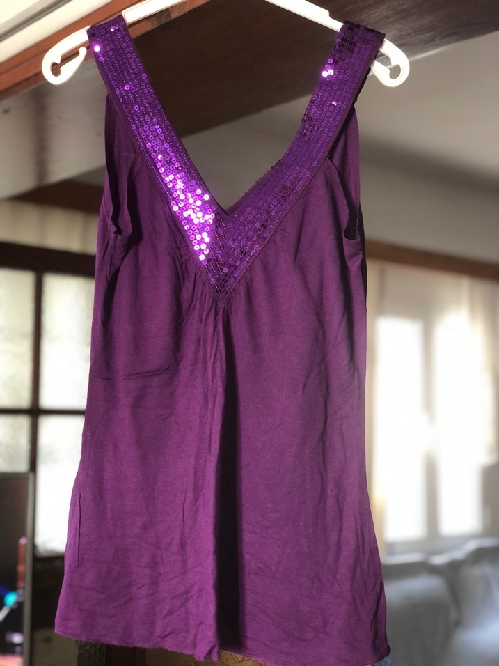 Parlak payet detaylı V yakalı, salaş kesim, mor renkte, kolsuz bluz Bohem tarzı ve parti için uygun. Etikette 42/44 diyor ancak ; S-M bedene uyar , kendim de S-M bedenim.