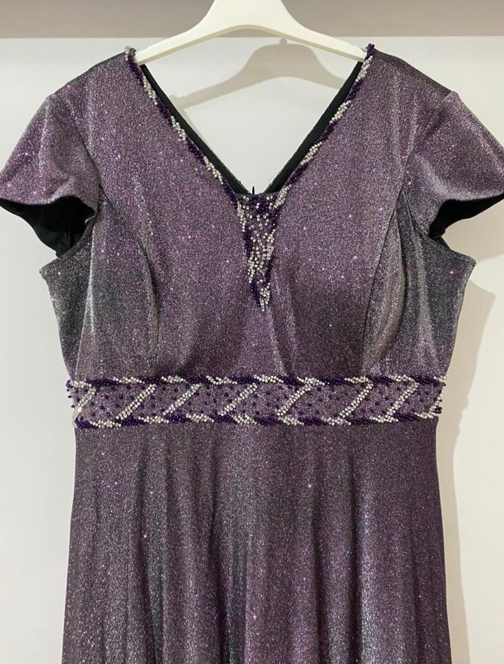 Parlak payetli ve nakışlı, V yakalı, askılı kollu, vintage gotik tarzda mor uzun ve vücuda oturan abiye elbise. ✨