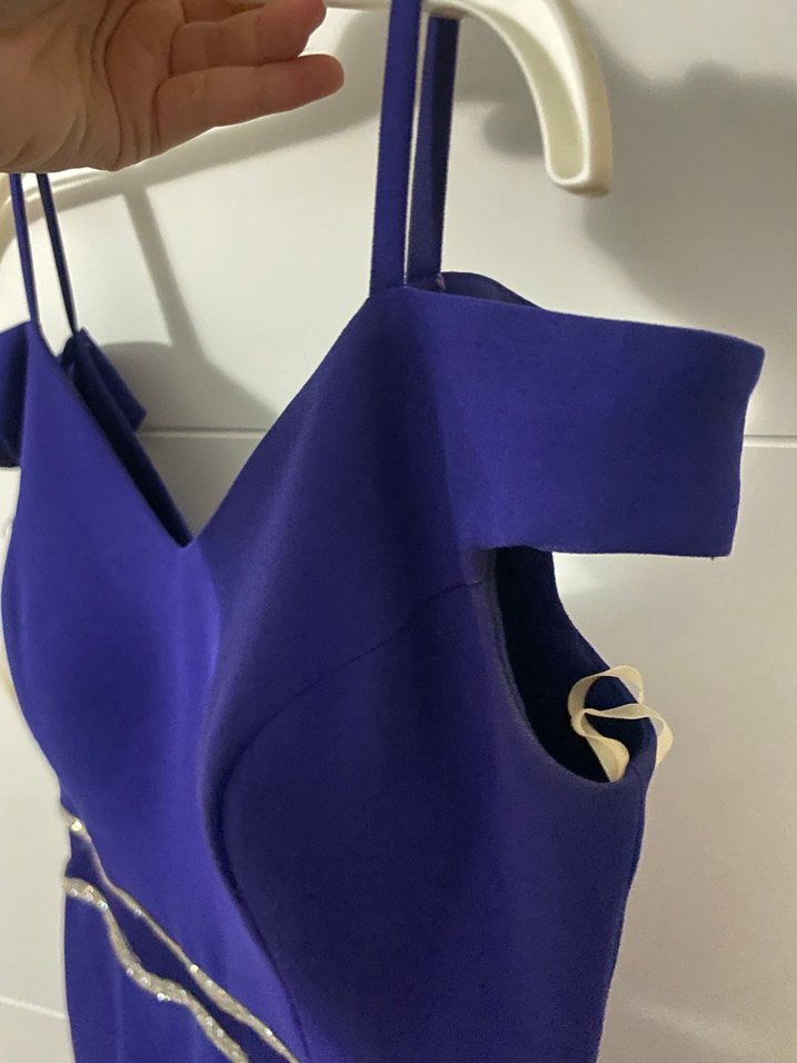 V yaka ve ince askılı, fermuarlı, parlak mor renkli uzun ve vücuda oturan kadın elbisesi. Romantik akşamlar için ideal.