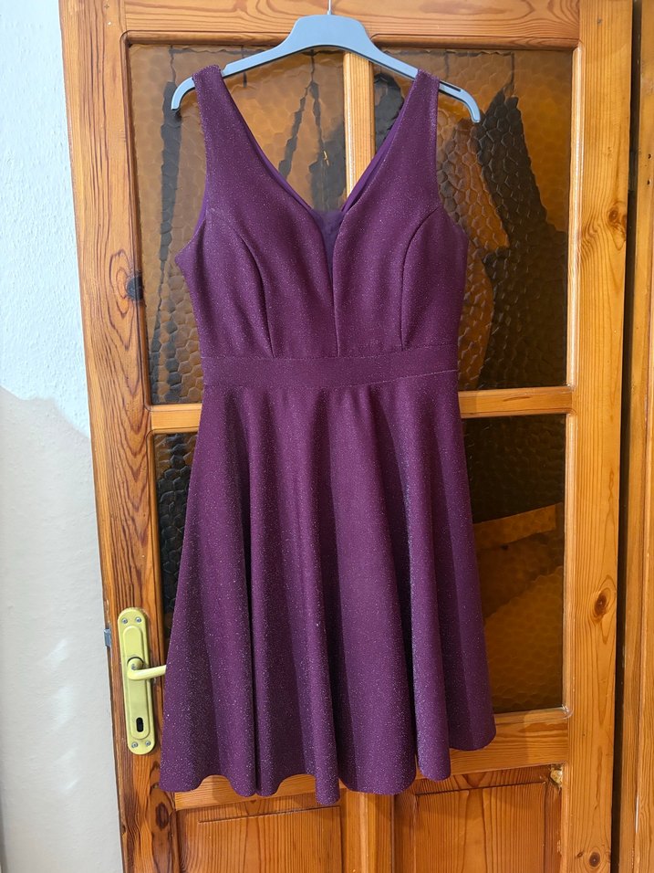 Parlak mor renkli, V yakalı ve kolsuz midi uzunlukta bu abiye elbise, drapeli tasarımı ve vücuda oturan kesimiyle parti için uygundur. Şık ve sade görünüme sahiptir.✨silikonla kumaş yapıştırılmıştı ama ben çıkarttığım için lekesi ama ama dıştan görünmüyor ve giyildiğinde sıkıntı olmuyor a