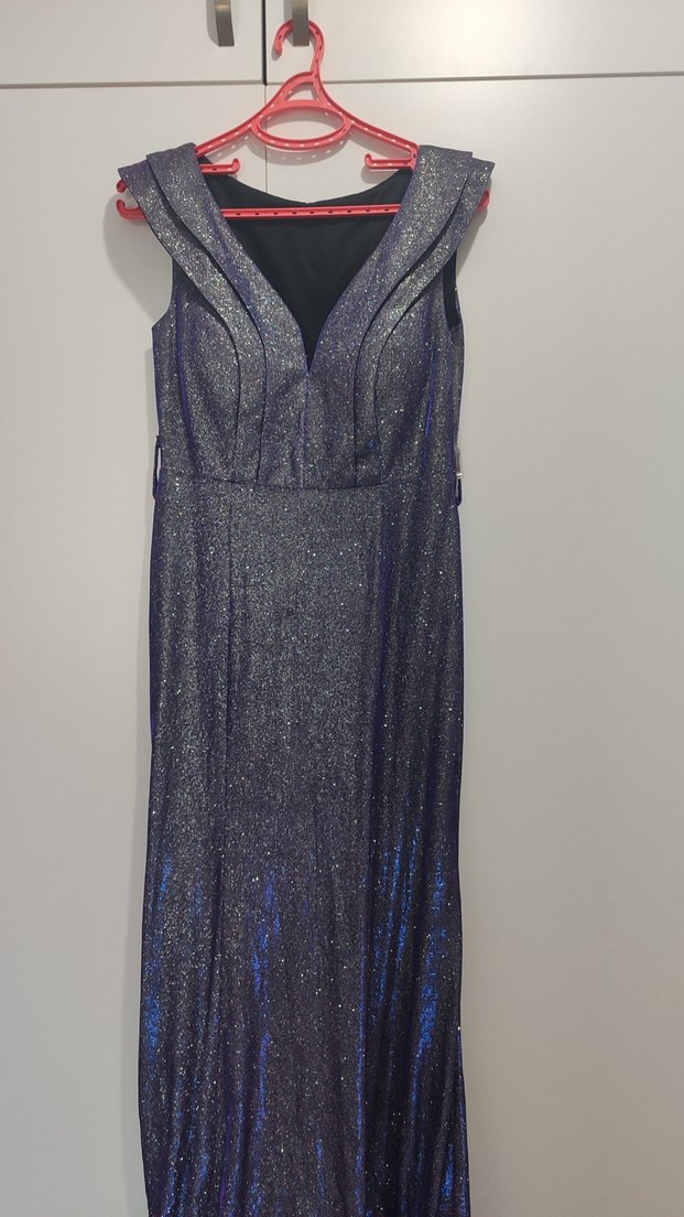 Parlak mor renkte, V yakalı, drapeli ve kolsuz uzun abiye elbise, şık ve fit kesimiyle parti için uygundur. mor ve gri simlidir ✨