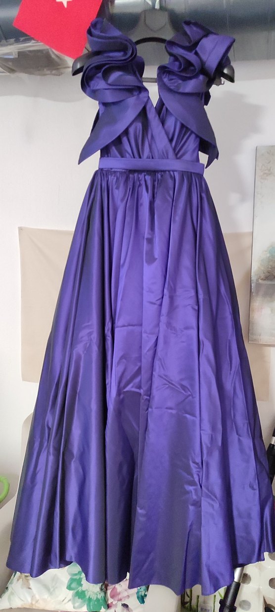 Parlak mor renkte, V yakalı ve askılı uzun drapeli abiye elbise, rahat kesimiyle düğünler için uygundur. Mor siyah parlamali güzel bir kumaş, nişan gibi etkinlikler için geline uygun, tarlatan ile kullanılabilir, etekleri kabarık çok güzel bir elbise. sadece bir kere giyildi, kuru temizleme yapıldı. Galisa Grace marka bir elbise, fiyat hakkında konuşabiliriz mesaj atınız