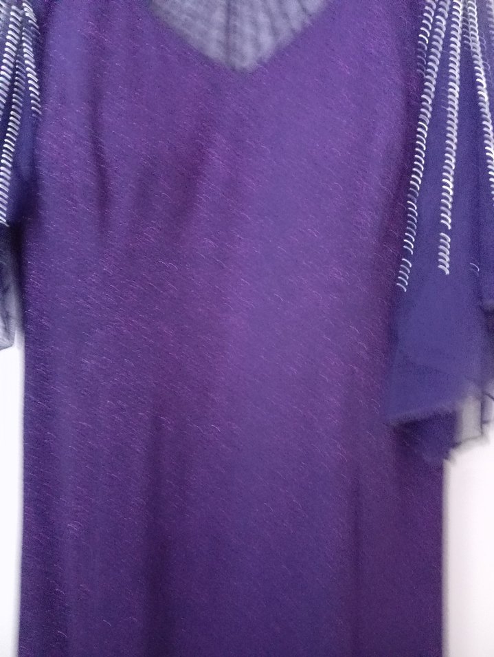Parlak kumaşlı, drapeli uzun mor abiye elbise. Kısa kollu, V yakalı, bol kesim ve gotik avant-garde tarzda, parti için uygun. ✨