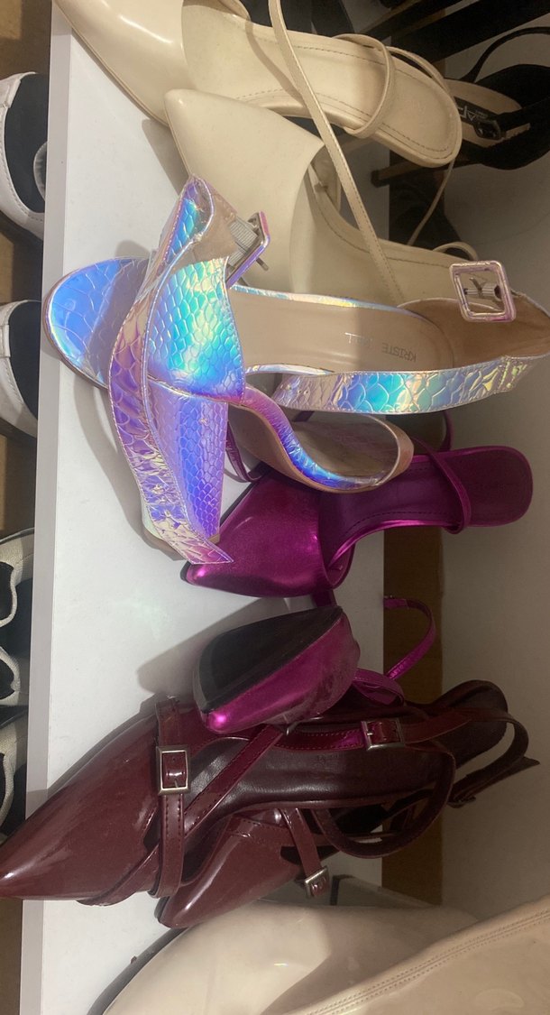 Parlak mor yılan derisi desenli, tokalı kayışlı yüksek topuklu deri ayakkabılar. Avant-garde tarz ve parti için uygundur. Fiyatlar icin dm atin takas var