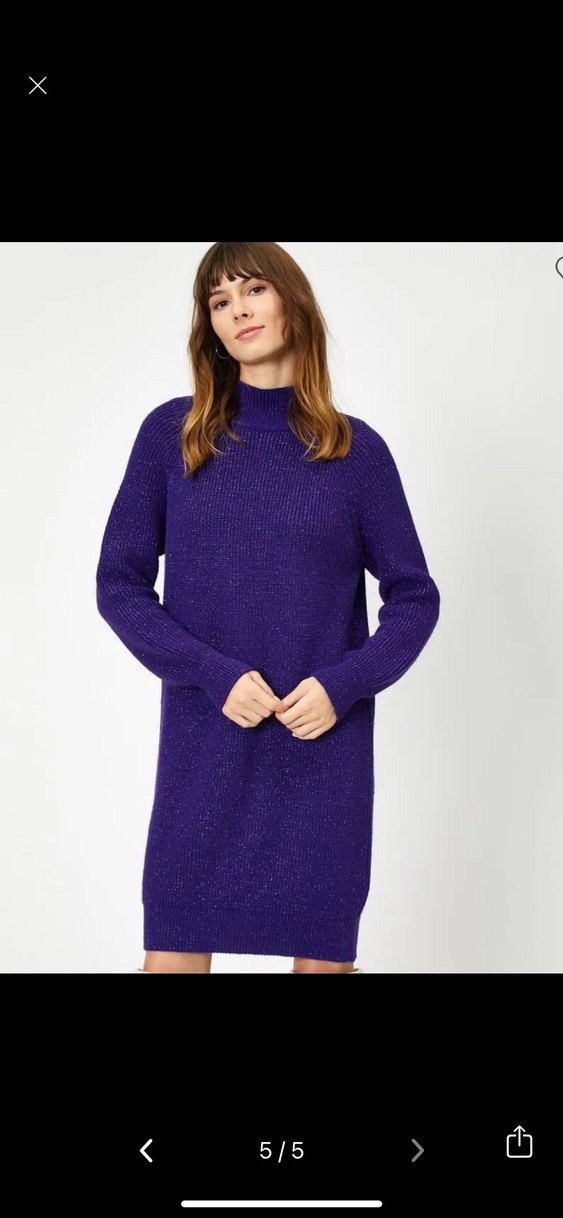 Parlak mor renkte, yüksek yakalı ve uzun kollu triko rahat ve çağdaş bir tarz sunar.