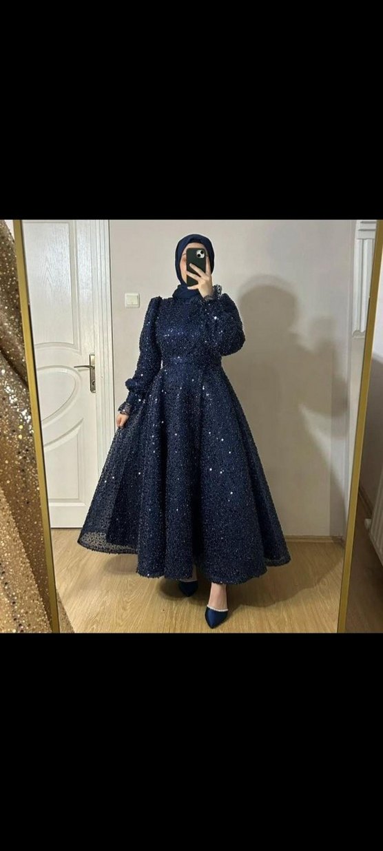 Lacivert uzun abiye elbise, yüksek yakalı ve uzun kollu, nakışlı parlak detaylara sahip. Düzenli kesim, mütevazı ve göz alıcı gotik tarzda, düğünler için uygun. ✨