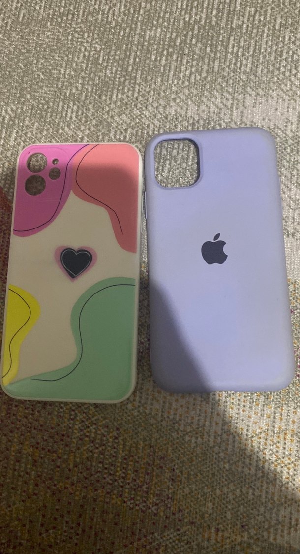 Parlak yüzeye sahip, pastel renklerde çok renkli pop kültür tarzı telefon kılıfları. Biri soyut pastel desenli ve kalpli, diğeri mor renkte Apple logolu. İphone 11 kılıf