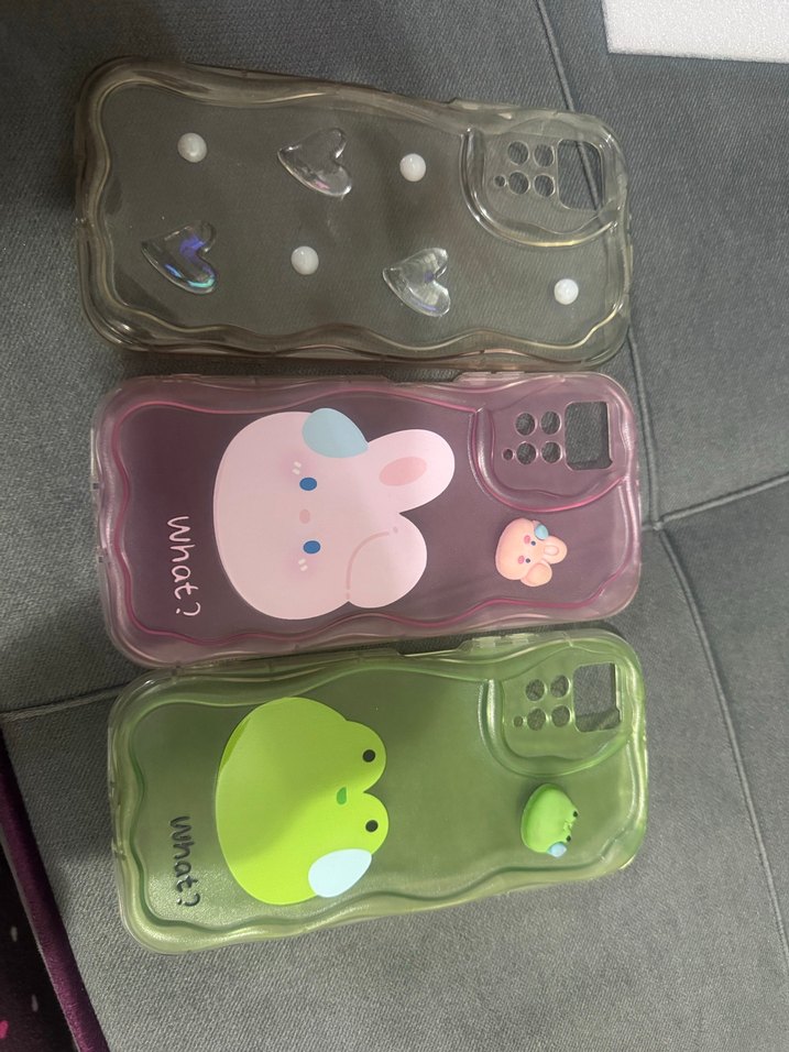 Parlak yüzeye sahip, pastel tonlarda ve çok renkli kalp, tavşan ve kurbağa desenli telefon kılıfı. Xiaomi redmi note 11pro ( pembe ve yeşil kılıfların kulakları koptu , şeffaf olanda çok az sarardı )