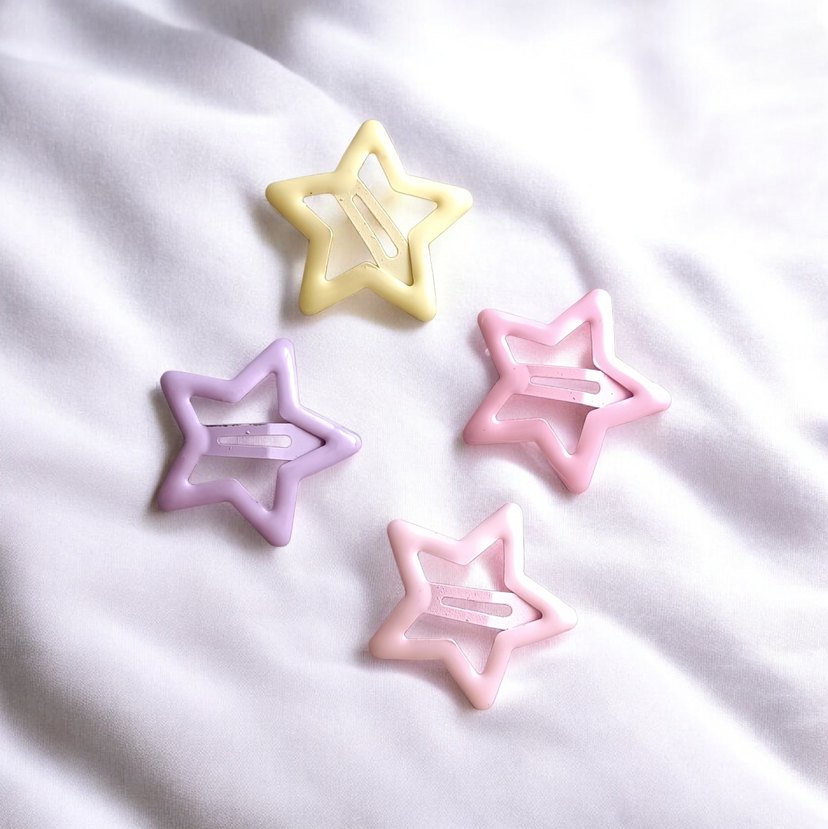 Parlak yüzeye sahip pembe, sarı ve mor pastel renklerde yıldız şeklinde, tie-dye desenli saç tokaları. Basit ve pop kültür tarzı.