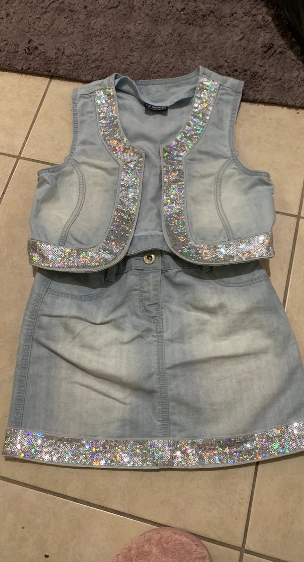 Gri kot kumaştan, kolu olmayan ve etek uçlarında payet işlemeli, dar kesim kız yeleği.✨