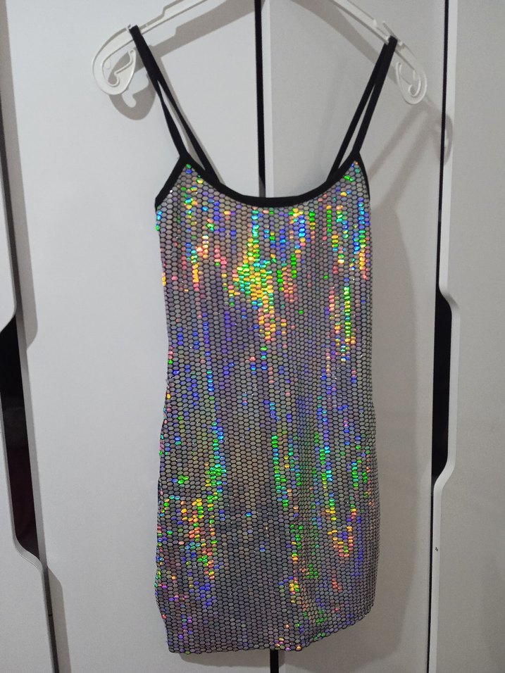 Bu dar kesim mini elbise, askılı ve çok renkli parıldayan payetlerle kaplıdır, parti için uygundur. ✨