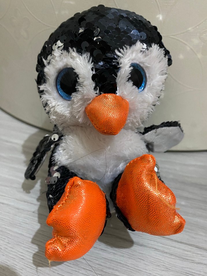 Parlak payetlerle süslenmiş, renkli peluş penguen oyuncak. Büyük mavi gözlü, turuncu ayak ve gagalı, yumuşak dokulu.