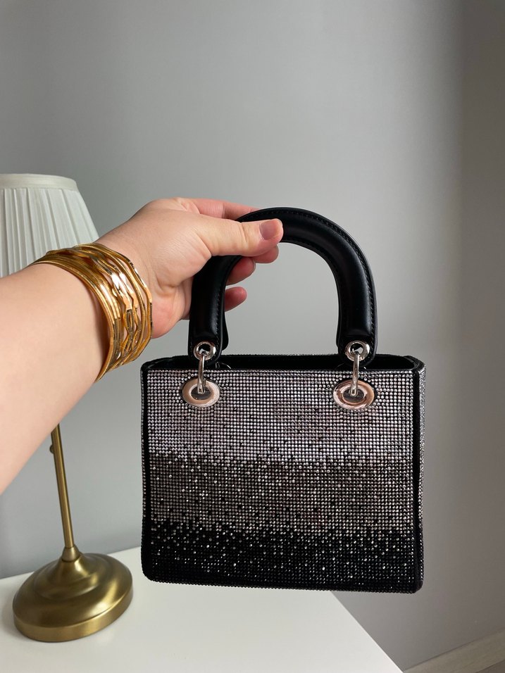 Siyah deri el çantası, parlak payetler ve deseniyle çağdaş bir tarz sunar, romantik akşamlar için uygundur.