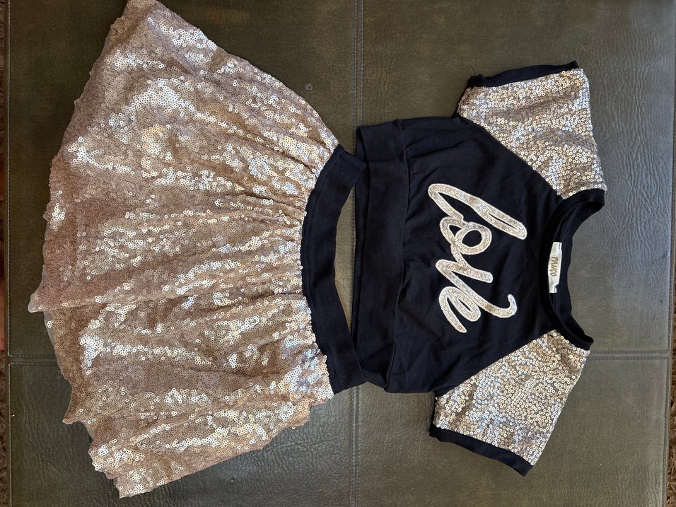 Parlak payetli etek ve "Love" yazılı baskılı siyah köpek elbisesi, street wear tarzında. ✨