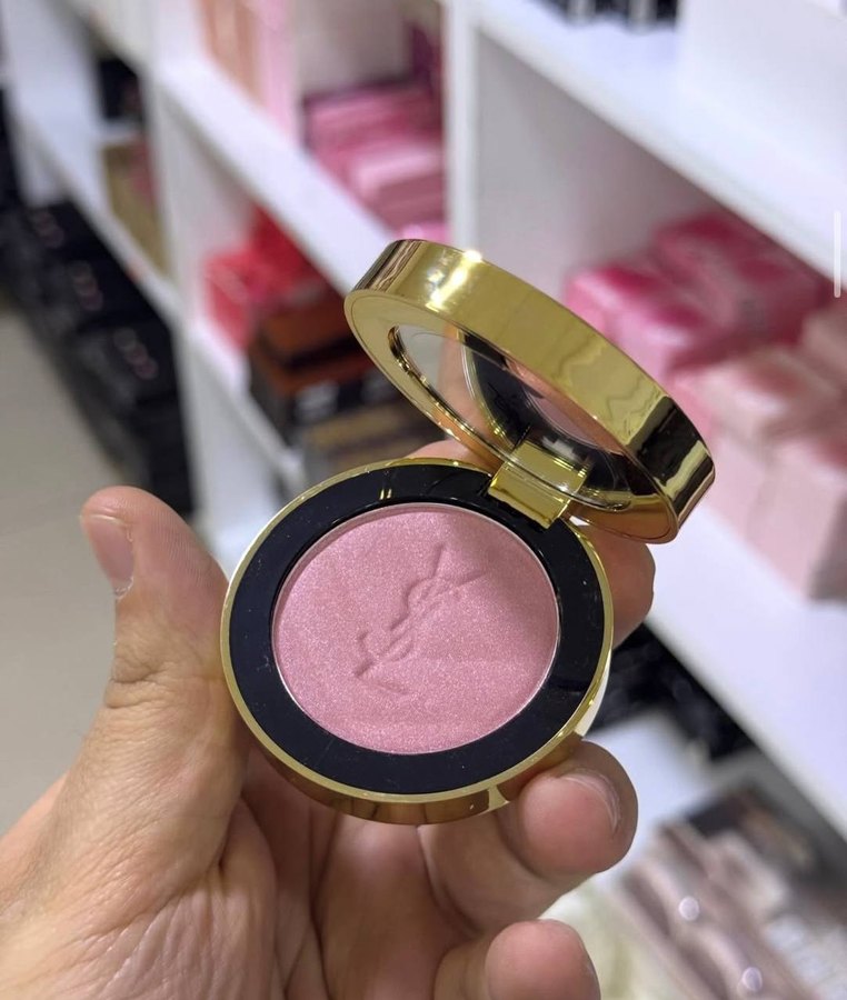 Altın kapaklı kompakt kutuda parlak pembe allık. Yanaklara doğal bir ışıltı katar.