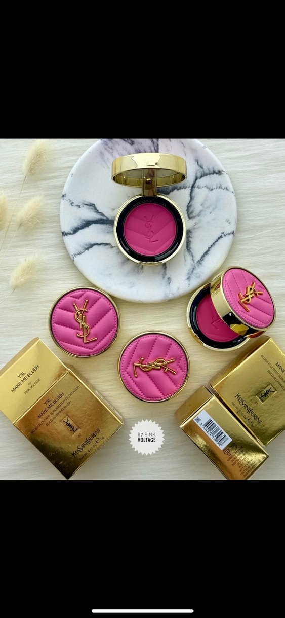 YSL marka, parlak pembe allık, kapitone desenli ve altın detaylı kutuda. Üzerinde kabartmalı YSL logosu bulunur. 87 no