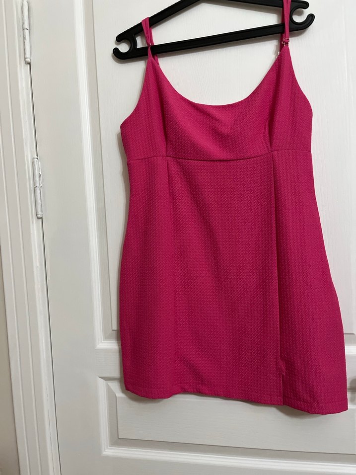Parlak sentetik kumaştan, askılı ve kolsuz, mini boyda, sade ve şık elbise.