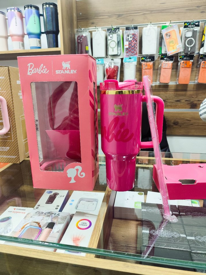 Parlak pembe plastik Stanley termos, renkli Barbie baskılı, mini boy ve uyumlu. Günlük kullanıma uygun, pipetli.