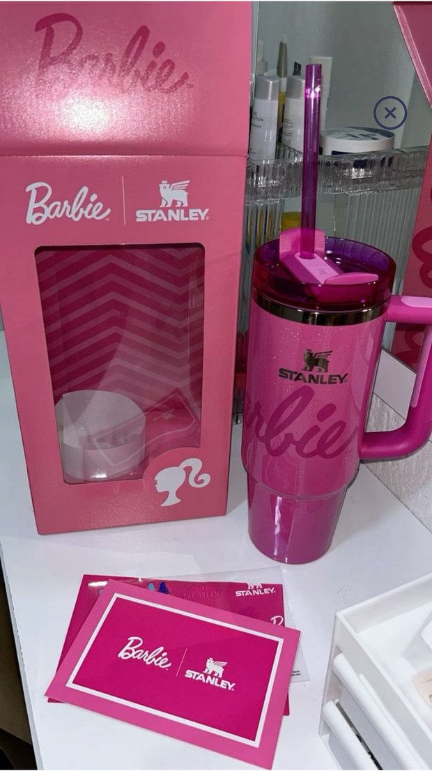 Parlak pembe renkte, Barbie logolu Stanley termos bardak, sap ve pipet ile kolay kullanım sağlar. İçecekleri sıcak veya soğuk tutar.