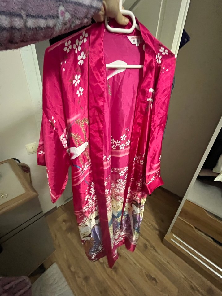 Parlak pembe tonlarda, uzun ve bol kesim bohem tarzı kadın sabahlık. Uzun kollu ve rahat bir yapıya sahiptir. Yurtdışı dan aldım.fazlalıktan satıyorum.boy 100cm iki kol 60 cm.harika ince satendir.