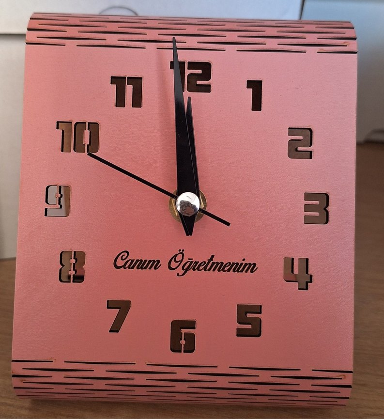 Parlak pembe renkte, büyük rakamlı ve "Canum Öğretmenim" yazılı masa saati.