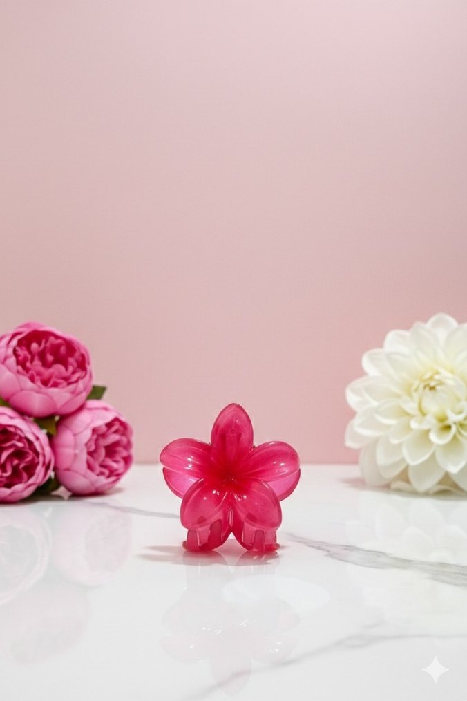 Plastikten yapılmış, parlak pembe çiçek şeklinde, minimalist ve çağdaş tasarıma sahip saç tokası.