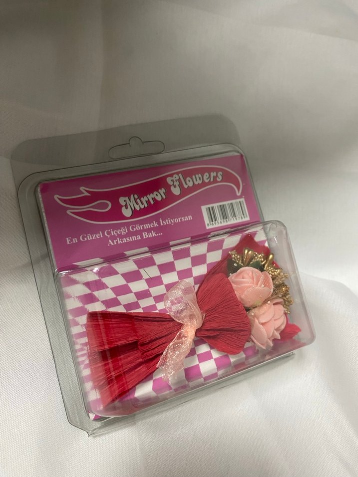 Parlak pembe renkte, çiçek ve kurdele süslemeli hediye aynası. Ambalajında 'Arkasına Bak' yazısı yer alıyor.