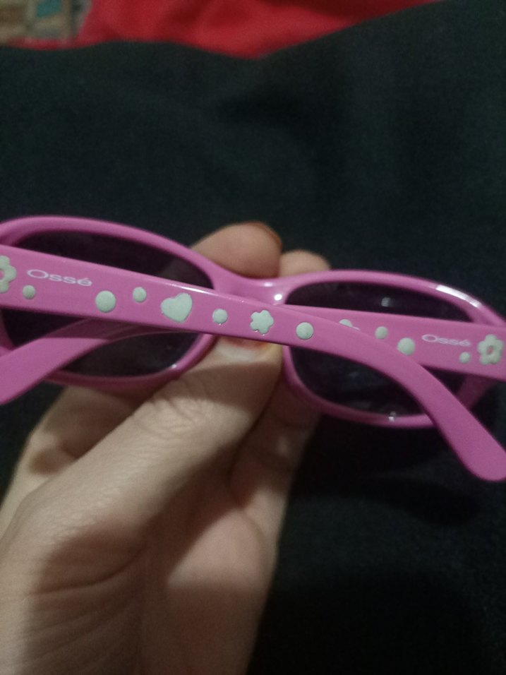 Parlak pembe renkte, renkli kalp ve nokta detaylarına sahip kadın güneş gözlüğü. Trendy ve rahat pop kültür tarzına uygundur.