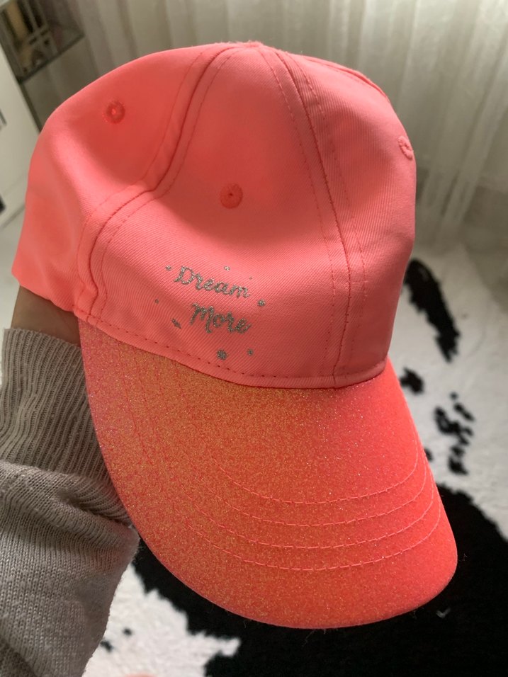 Pastel pembe çocuk şapkası, parıltılı siperliği ve önünde 'Dream More' yazısı ile trend sokak stiline uygun.