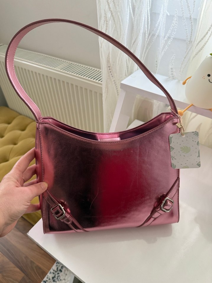 Parlak pembe deri, tokalı detaylara sahip, tek askılı ve desensiz kadın çantası. Günlük kullanıma uygun. Fabrika Marka etiketi üstünde hiç kullanılmadı kol çantası çok tatlı güzel parlak bir pembe rengi var.