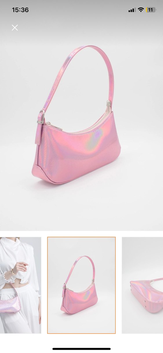 Minimalist tasarımlı, parlak yüzeyli pembe deri kadın omuz çantası, günlük kullanım ve sokak stiline uygundur.