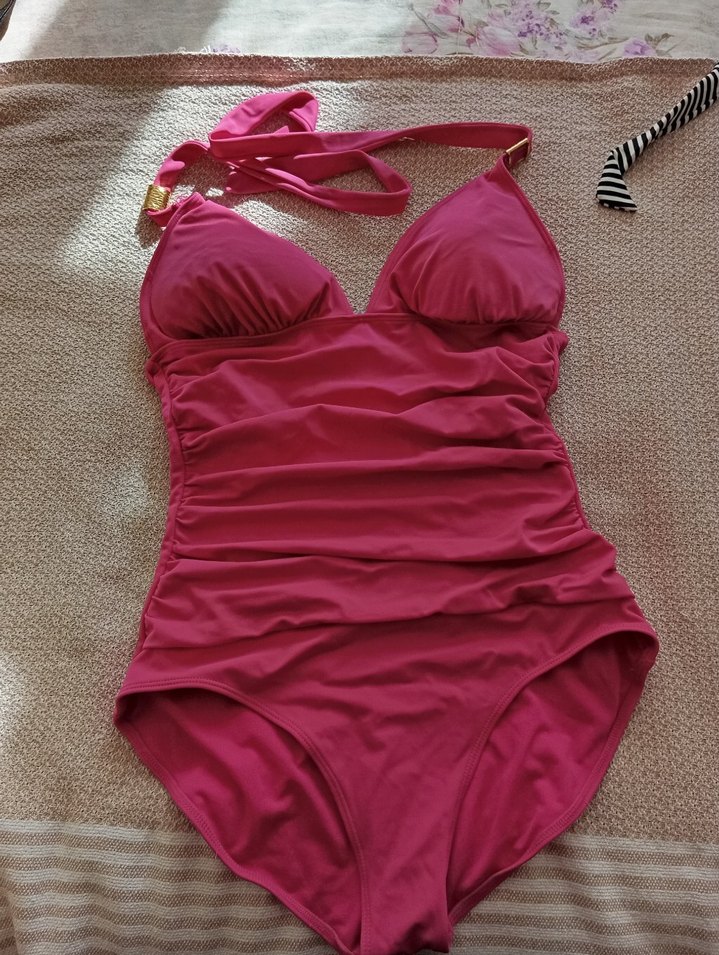 Parlak pembe renkte, drapeli detaylara ve ince askılara sahip, vücuda oturan kadın mayo. Sahil için çağdaş ve göz alıcı bir tasarım. ✨