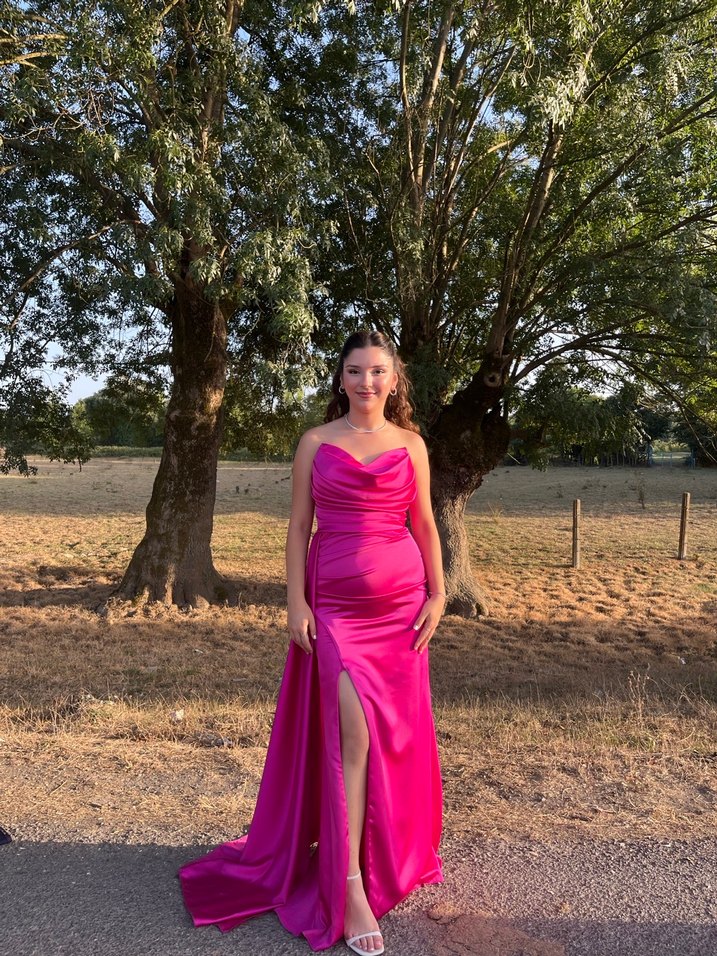 Parlak pembe, uzun ve drapeli bu abiye, straplez yaka ve ince askılara sahiptir. Yanında yırtmaç bulunur, düğünler için uygundur. ✨