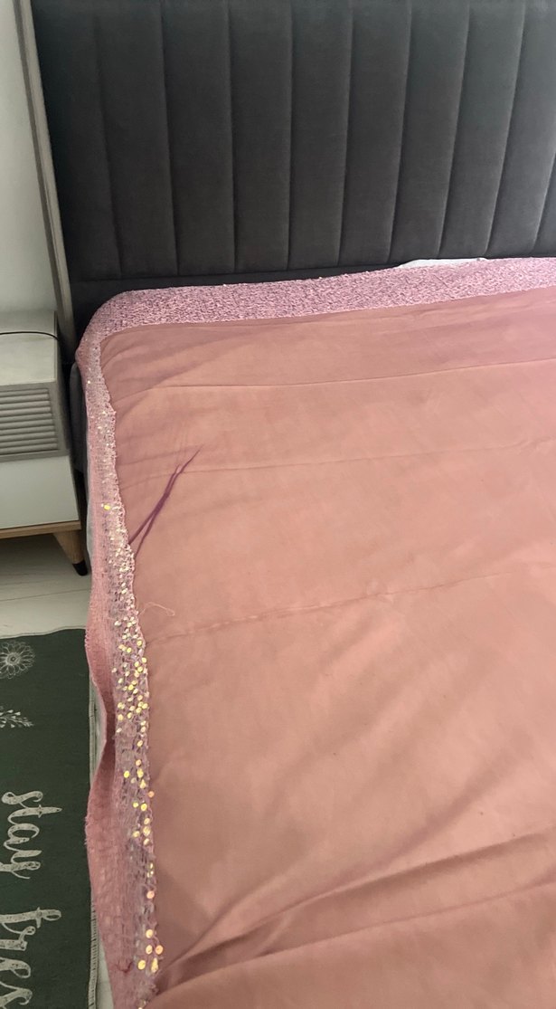 Parlak pembe düz yatak örtüsü, yumuşak dokulu ve hafif süslü kenarlıklıdır. Yatak odasına zarif bir dokunuş katar.