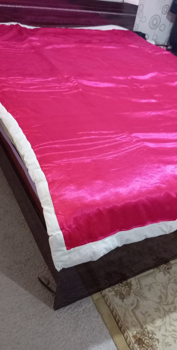 Parlak pembe renkte, düz desensiz ve beyaz kenarlıklı yün yorgan. Yatak odasına parlak ve şık bir dokunuş katar ️. Bir lekesi var.