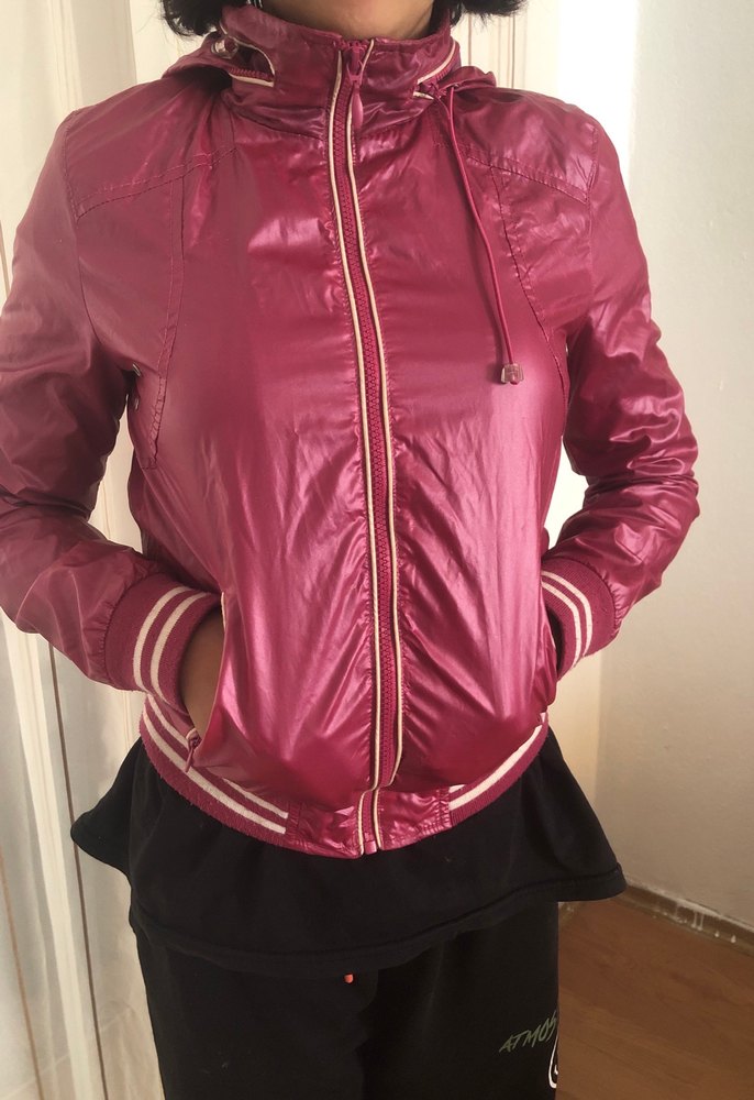 Parlak pembe renkte, fermuarlı, yüksek yakalı kadın ceketi. İnce kesimi ve askılı kolları ile günlük kullanıma uygundur. ✨